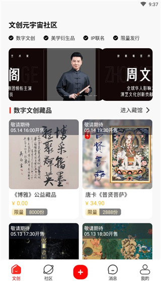数字藏品市场:浏览、购买、收藏各类数字艺术品,支持二级市场交易。