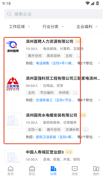 3、在“公司”栏目,你可以看见到入驻软件的各大公司,他们的详细资料和目前在招聘的岗位都能看见。