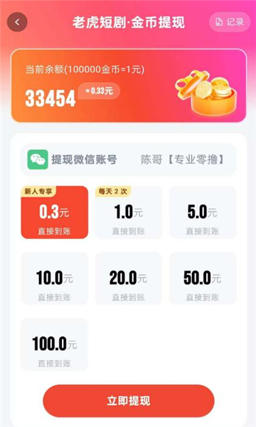 老虎短剧app是款能够让用户在娱乐的同时赚取收益的软件,通过刷短剧、完成任务、邀请好友赚取金币奖励,金币可以直接提现到账号上,最低支持0.3元,打开就能领取丰厚奖励,还有海量优质短剧,感兴趣的朋友可以下载试试!