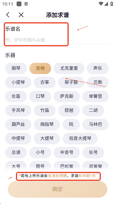 输入自己喜欢的谱子名字和乐器,注意求谱的有效天是七天