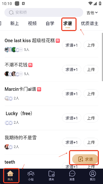 在软件上没有找到自己喜欢的曲谱的用户,可以点击首页的求谱板块,点击“求谱”