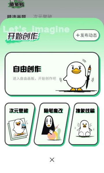 兔兔鸭app是款年轻人的涂鸦创作交流平台,也可以称为灵魂画手俱乐部,它为用户提供了多样化的创作形式,包括自由创作、随笔魔改、抽象线稿等,并且提供了一个积极向上的创作社区供用户之间互动交流。