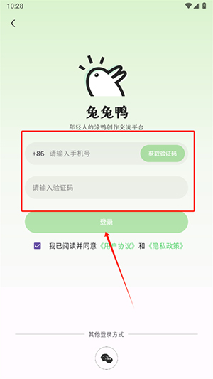 进入登录界面输入手机验证码,点击登录,未使用的手机号会自动注册。