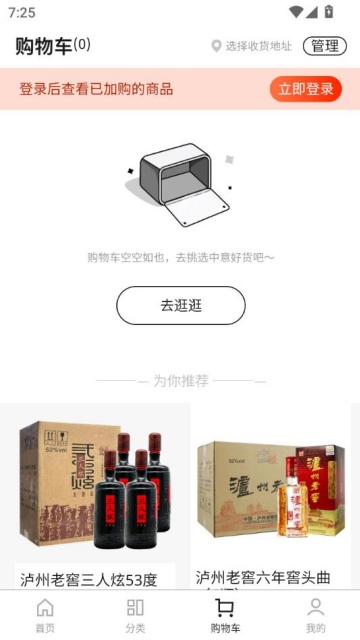 进入首页先点击下方“立即登录”登录/注册,然后返回软件点击购物车。