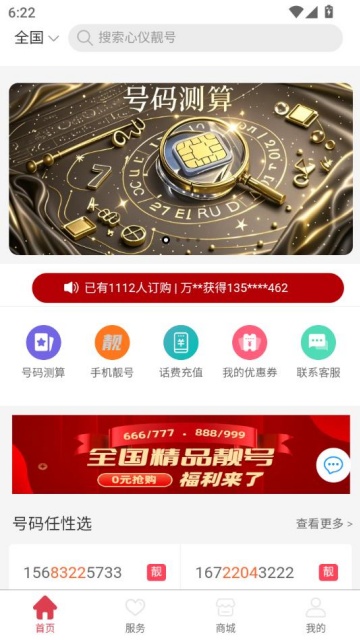 号令天下app是款全面通讯服务平台,不仅拥有基本的手机靓号、话费充值以及优惠券等,还引入了全新有趣的号码测算,让其泛用性更广,除此之外还有礼品丰厚的商城,支持各种卡扣以及商品交易。