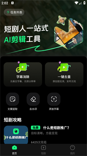 聚能推app是一款可以进行快速创作和变现的手机软件,提供了视频剪辑,添加字幕,去除水印,批量处理等一系列功能,还可以选择自己喜欢的短剧进行推广赚用户,让你轻松掌握流量密码。