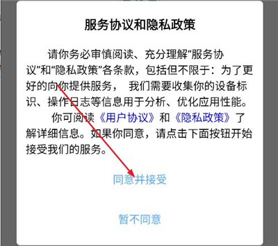 1、下载安装集材通app,打开之后点击同意并接受;