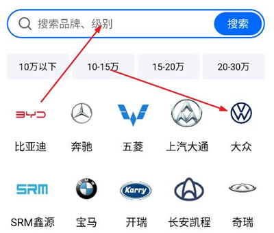 支持按品牌、级别、动力类型等条件精准筛选车辆。