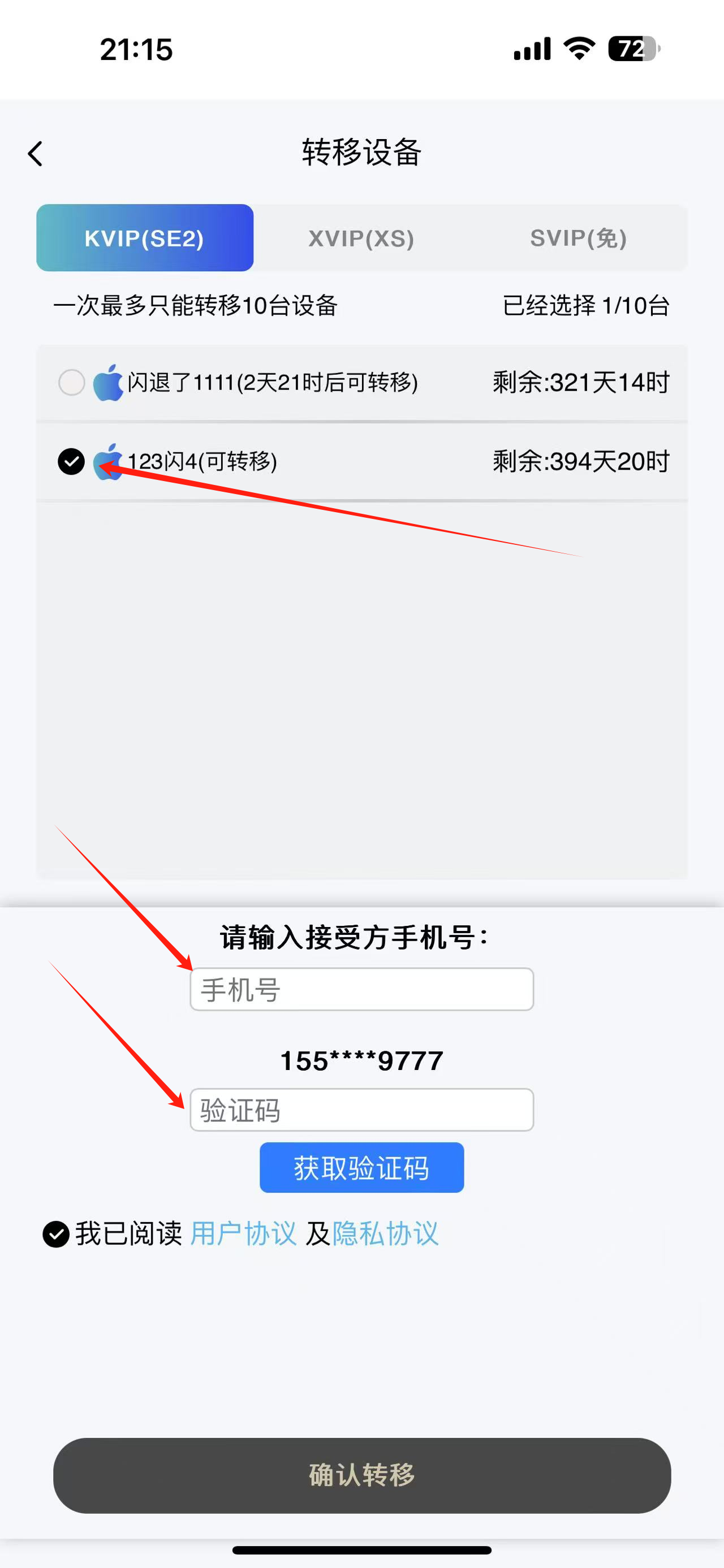 4、勾选需要转移的设备,输入手机号,获取验证码,阅读协议确认转移即可。