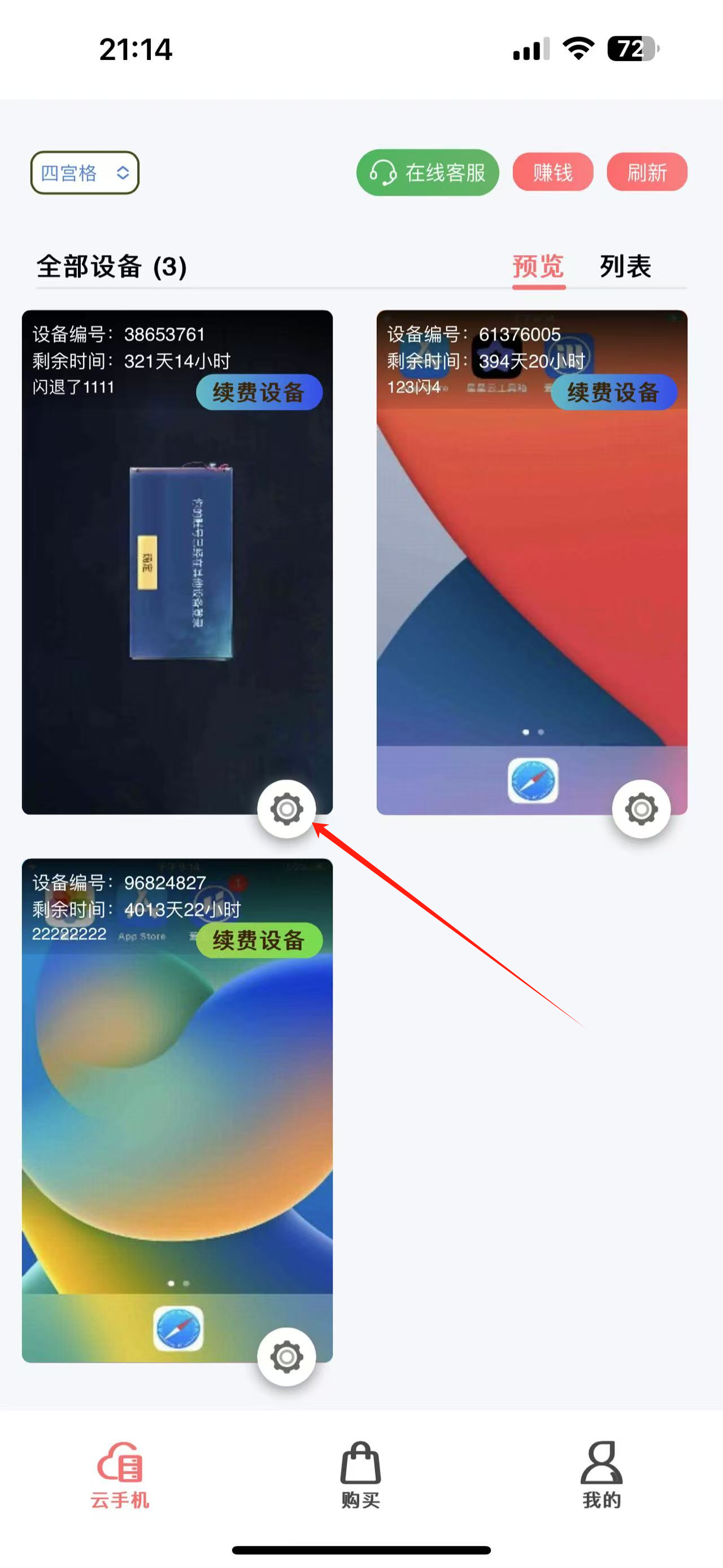2、登录后点击云机下方的齿轮按钮。