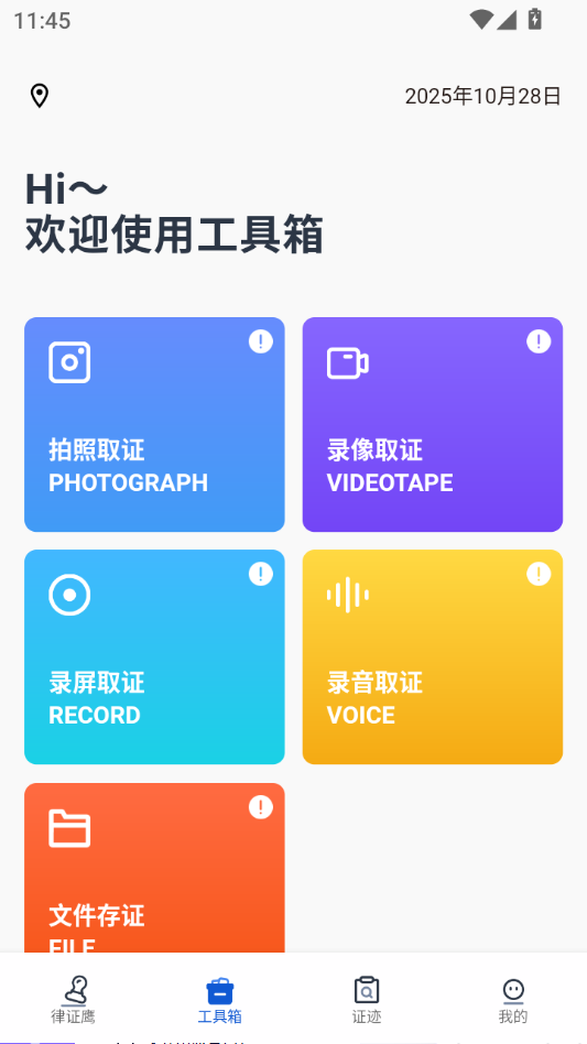 律证鹰app是款专注于法律取证的辅助工具,它能够精准抓住普通民众在日常生活中,取证难、不懂法的痛点问题,将复杂的法律取证简单化、普标化,让每一位用户都会使用,自己手动收集证据维权。