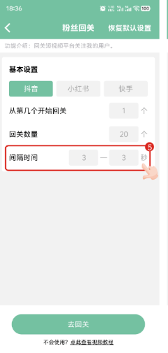 4、间隔时间是回关一名粉丝到回关下一名粉丝的间隔时间,可以是时间范围。
