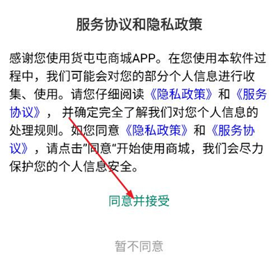 1、下载安装货屯屯app,打开之后点击同意并接受;