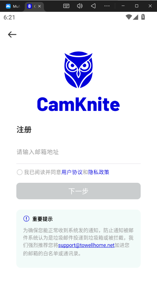 输入邮箱地址,勾选我已阅读并同意,点击下一步。