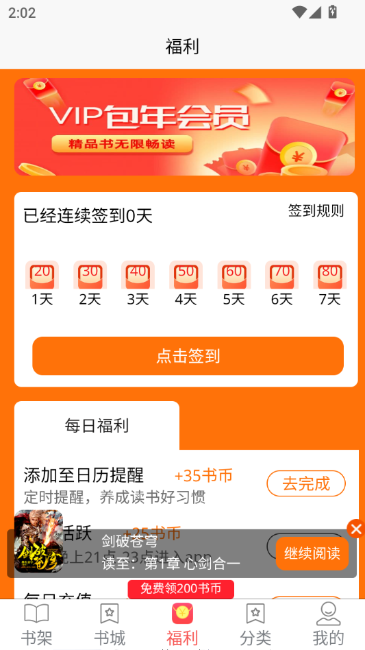 进入书架页面,点击福利。