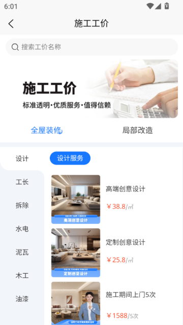 可搜索建材品牌、型号的价格,或按工种查询人工费用,生成初步预算。