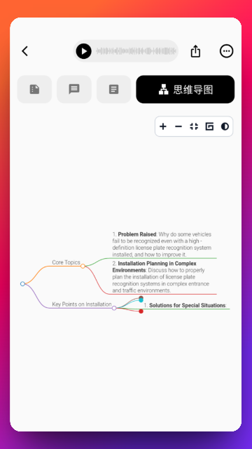 4:在录音处理界面,可生成思维导,直观呈现音频核心要点(如问题、核心主题、解决方案等),还可进行播放、分享等操作。