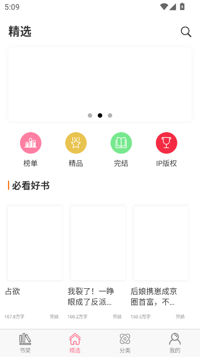 进入精选页面,这里推荐了许多优质小说资源。ps:由于小编网络卡顿所以无法加载图片。