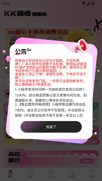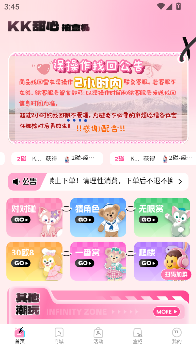 KK甜心潮玩app是款正版潮玩商城,其中提供了丰富的盲盒抽赏商品,聚焦于各大热门IP联动潮品,都是官方授权,价格实惠且拥有正品保障,所有盲盒的概率公开透明,可以根据自己的需求选择参与。