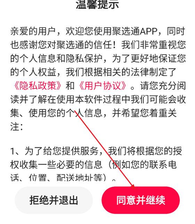 1、下载安装聚选通app,打开之后点击同意并继续;