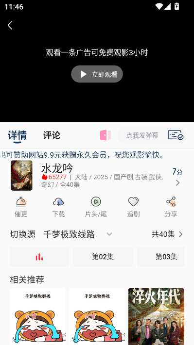 进入观看页面会出现上图情况,直接点击立即观看,无需看广告可以直接进入正片。