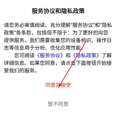 1、下载安装明樽云商app,打开之后点击同意并接受;