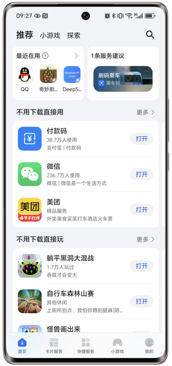 点击卡片、快捷服务及游戏可使用相应服务,点击桌面可将此卡片添加至桌面,点击添加可选择添加到桌面或负一屏。