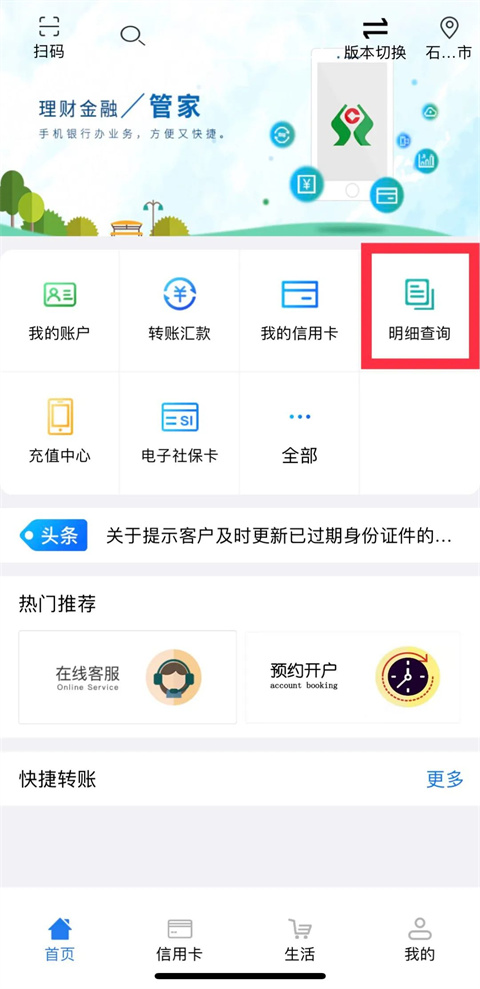 支持银行卡绑定、余额查询、交易明细查看、电子回单下载、账户挂失等基础操作。