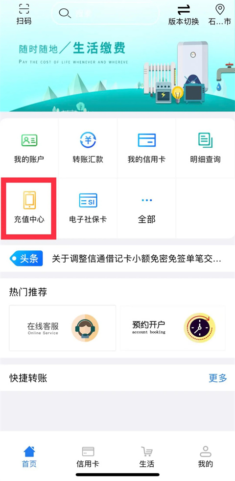充值中心则提供了许多日常缴费服务。