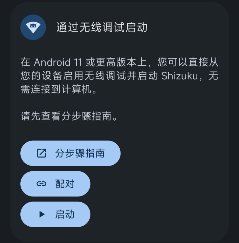 二,打开shizuku,点击软件内的配对按钮(此步骤需要在WiFi环境下进行,配对完成后可关闭WiFi,除非设备重启或者强制停用shizuku,一般不需要再次配对)