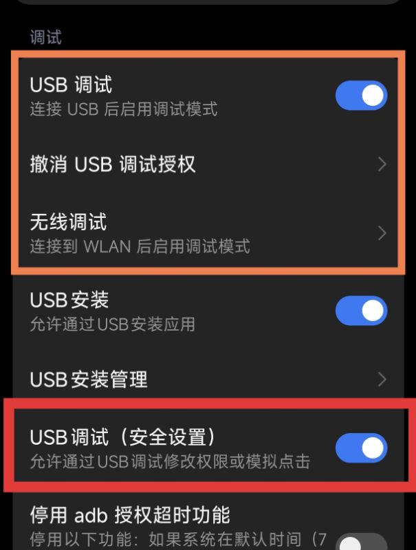 找到USB调试以及USB调试(安全模式),将这两个按钮全部打开,务必将这两个按钮全部打开!!!