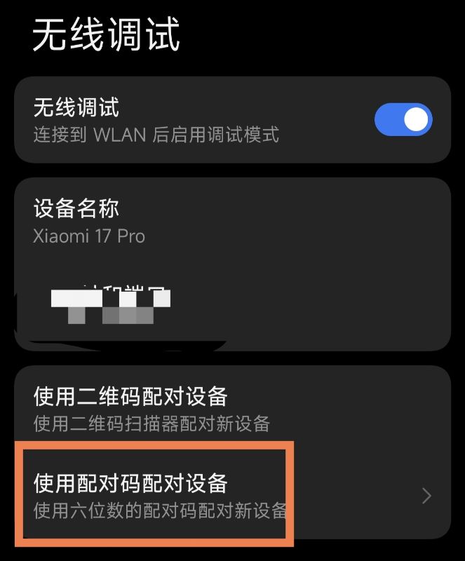 进入无线调试界面后,打开无线调试按钮,并点击下方的《用配对码配对设备》