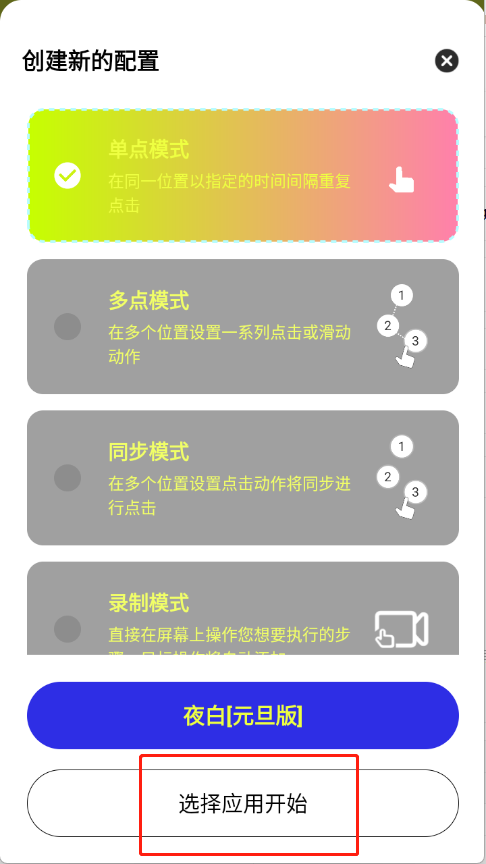 多种模式随心切换:夜白连点支持多种点击模式,覆盖用户日常使用的各类需求。单点模式适用于单次触发场景,连点模式适合需要连续点击的游戏操作,区域点击模式则可以在屏幕指定区域内自动点击。