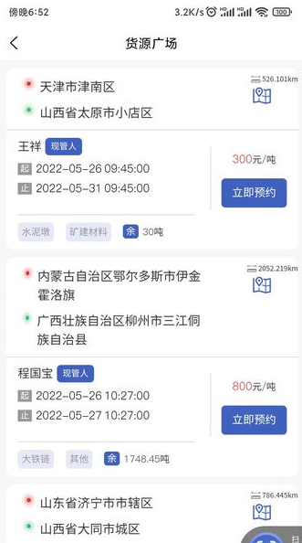 5、货源广场展示大量货运信息,支持一键预约并查看起止地点与运费详情。