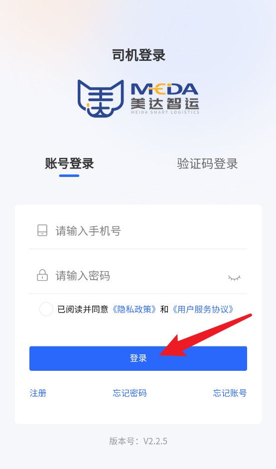 1、登录页面输入手机号与密码后勾选协议,再点击蓝色“登录”按钮即可进入系统。