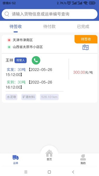 4、运单页面支持按状态查看,可实时追踪待签收、待收款和已完成的运输订单。