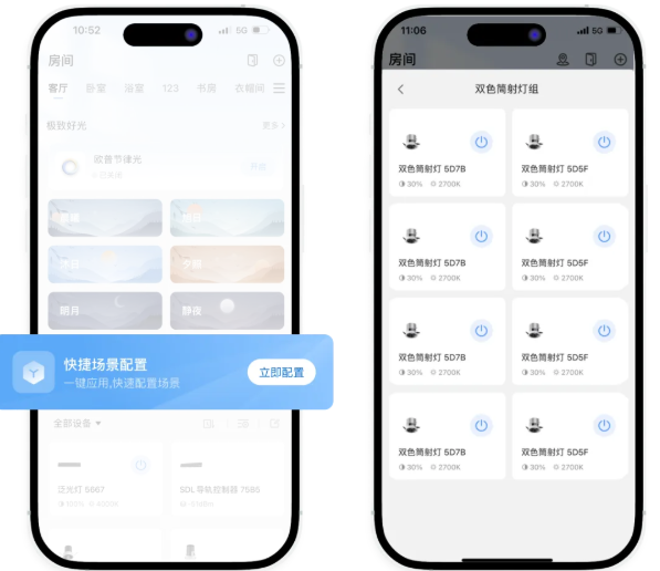 设备快速配网:一键添加欧普智能吸顶灯、筒灯、灯泡、灯带等产品,支持批量配置;