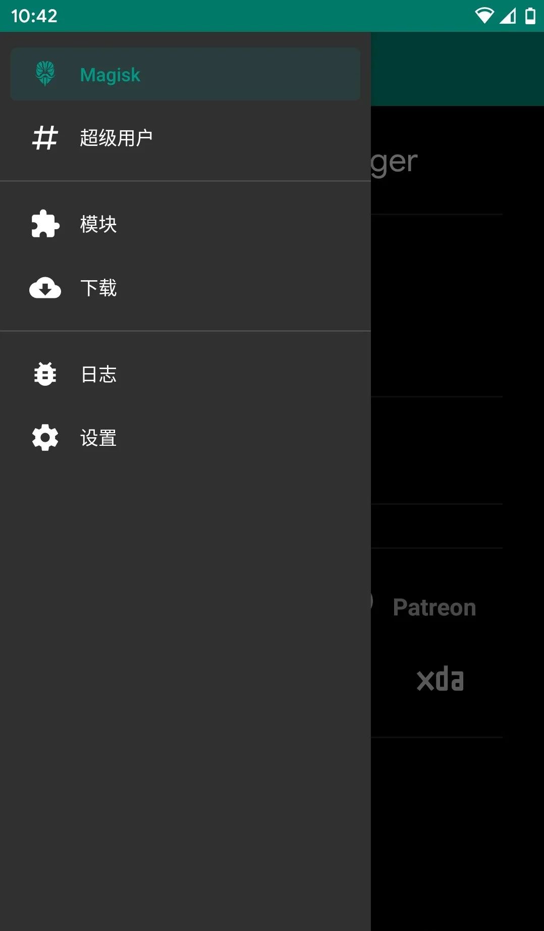 1.需要准备Magisk面具和Edxposed模块。第一步,打开面具,点击菜单按钮,选择模块。