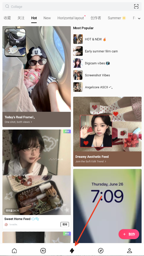 6.在主页面中间栏的创作按钮,可进入灵感专区,大家可以在这里找到拍照、p图攻略、灵感。
