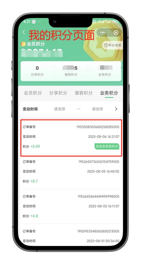 粉丝下单后选品官奖励积分到账,在【我的】-【我的积分】-【业务积分】查看选品官奖励积分。
