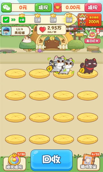 猫咪三合一合成:将3只相同等级猫咪拖到一起,合成1只更高级别的新猫咪。