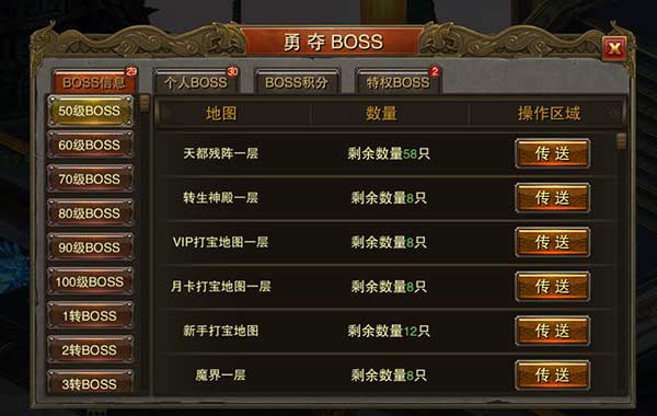 勇夺BOSS图标位于整个游戏的右上角,是争夺BOSS的指向标!玩家可以看到所有可攻击的BOSS信息,并且可以快捷传送到BOSS地图,通过BOSS信息可以直观看到每个危险区域BOSS的刷新状态。