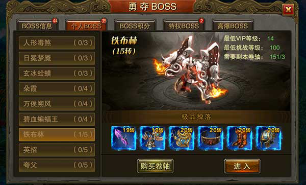 还可以进入个人BOSS界面挑战,获取装备,材料,个人BOSS总共有9个,等级转生等级提升难度逐步提升,个人BOSS每天可以挑战一定的次数,挑战成功可获得海量经验和魂珠碎片奖励,还可以花费少量天晶领取三倍奖励,使奖励倍增,这样可以快速的提高战斗力,进入个人BOSS需要消耗副本卷轴,可以在在线礼包和活动中获得副本卷轴,新手打宝地图和商城绑定天晶区也可以获得。